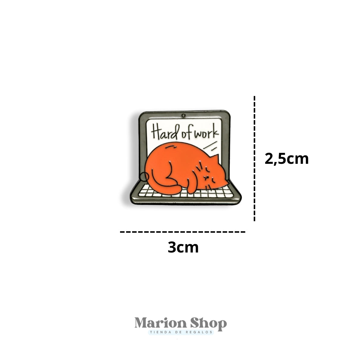 Su diseño metálico esmaltado muestra a un adorable gatito dormido sobre su computador, ideal para los que aman el humor cotidiano.